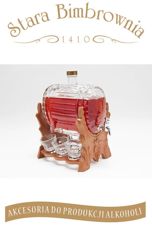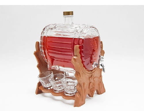 Beczułka wykonana z grubego, zdobionego szkła. Zaopatrzona w kranik u swojej podstawy. W komplecie piękna i stylowa podstawka w której są umieszczone kieliszki. Beczułka zamykana na zakrętkę.