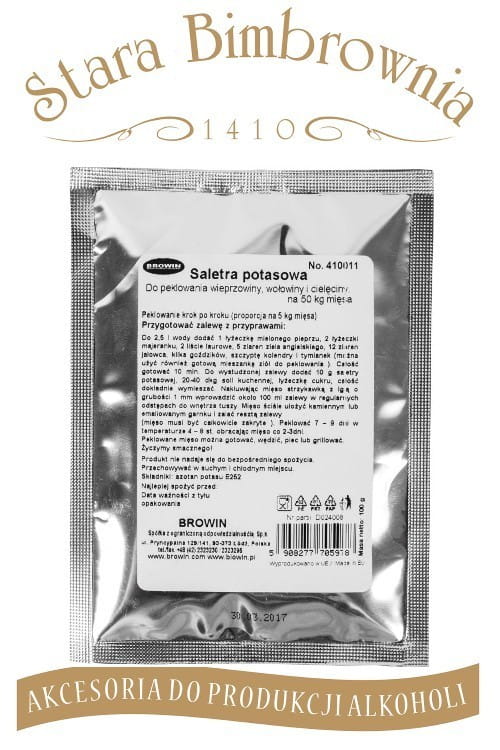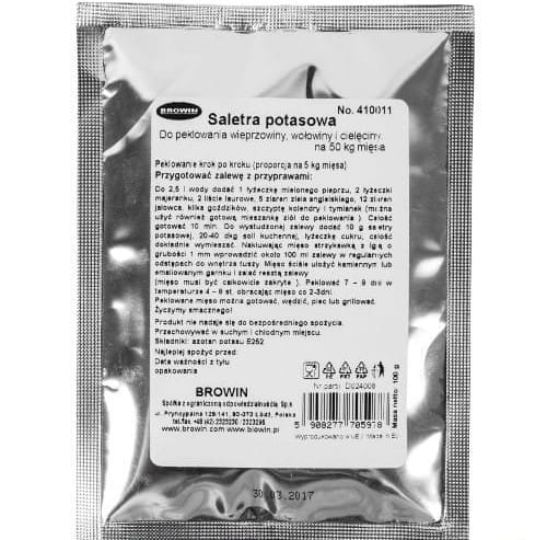 Saletra potasowa do peklowania mięs. Starcza na 50 kg mięsa. Nadaje się do przygotowania zalewy. Nie nadaje się do bezpośredniego spożycia.