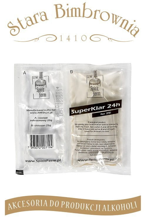 Środek klarujący SpiritFerm SuperKlar 24h. Jeden z najlepszych środków do szybkiego klarowania zacierów i win. Bardzo skuteczny i łatwy w użyciu. SuperKlar 24h podzielono na dwie szaszetki: